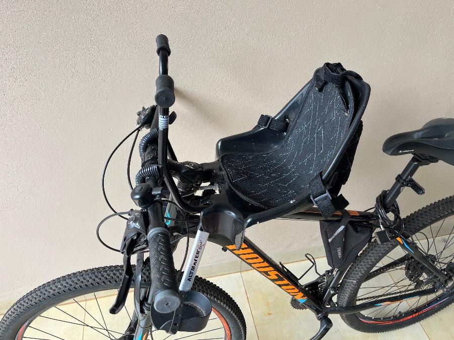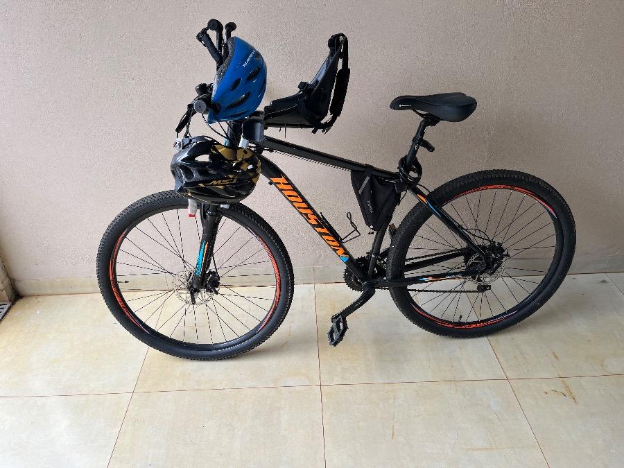 Bicicleta ideal para passeios e uso urbano, com marchas, freios a disco e pneus resistentes. Confortável e segura. Opcionais: cadeirinha infantil com cinto, capacete infantil (azul) e capacete adulto. Uso indicado para ruas e ciclovias.